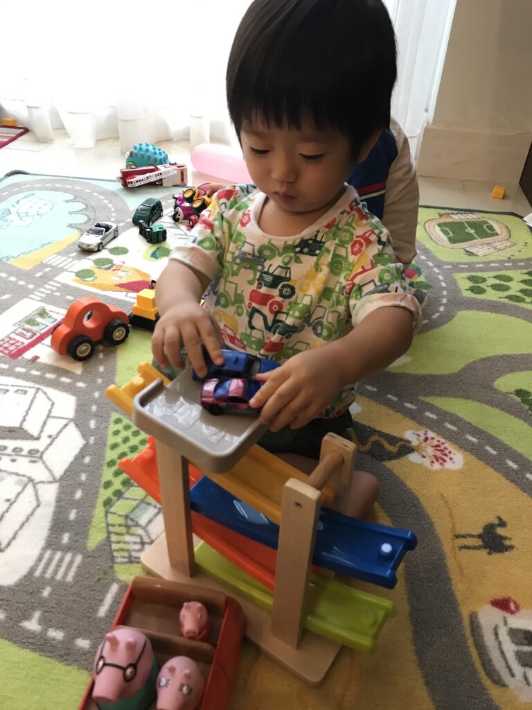 このお友達の場合は、車や電車といったタイヤがあるものに興味があったので、車がテーマのケーキや、たくさんの車のおもちゃが用意されたプレイスペースがあり、入った瞬間、主役の「好きなもの」が溢れた空間が出来上がっていました。